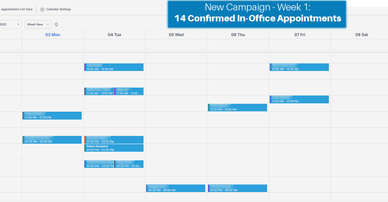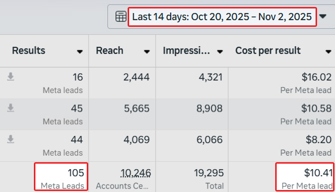 In just 14 days, this clinic invested approximately $1,000 in ad spend and generated over 100 qualified leads through Meta, resulting in 14 confirmed in-office consultations for their peptide protocol program.